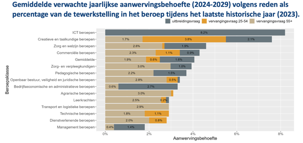 Die krapte is geen momentopname, maar het zichtbare gevolg van een dieperliggend structureel probleem. Het grote verhaal zit in de demografie. De vervangingsvraag van 55-plussers explodeert. Tussen 2023 en 2028 verlaten gemiddeld 395.400 mensen de arbeidsmarkt via pensioen of arbeidsongeschiktheid. Dat is 13,1% van de totale tewerkstelling, tegenover 9,7% in de periode 2013–2018.
